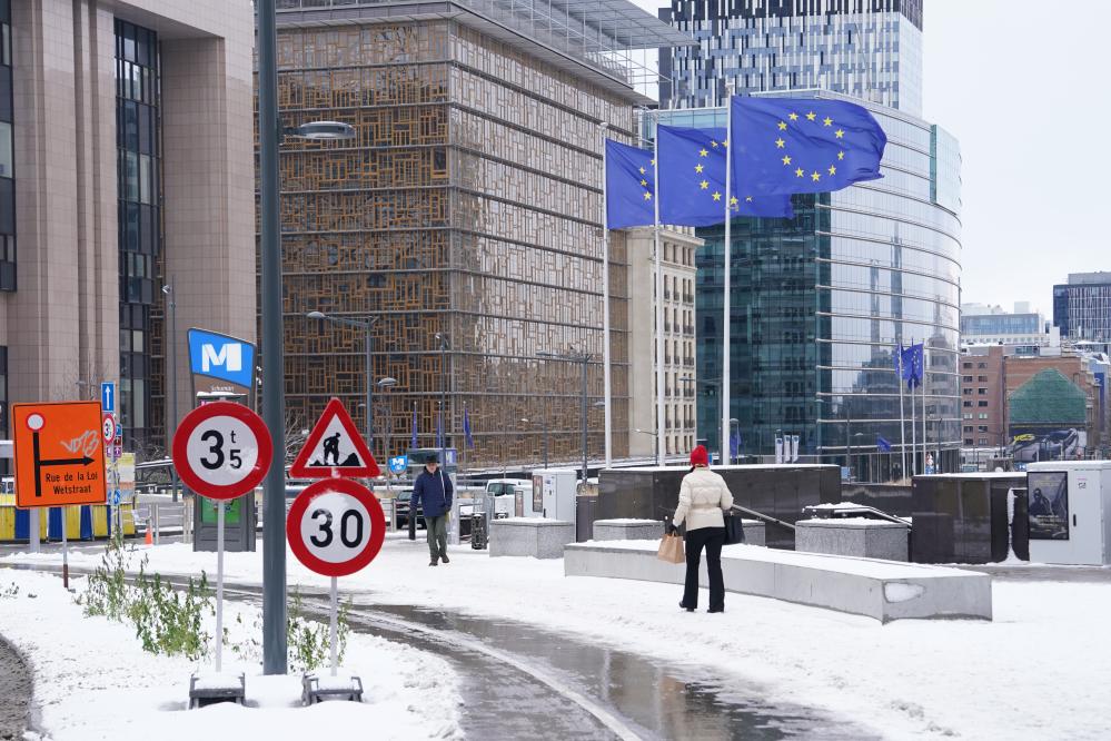2026年1月7日,在比利时布鲁塞尔,市民在雪中步行。新华社记者彭子洋摄