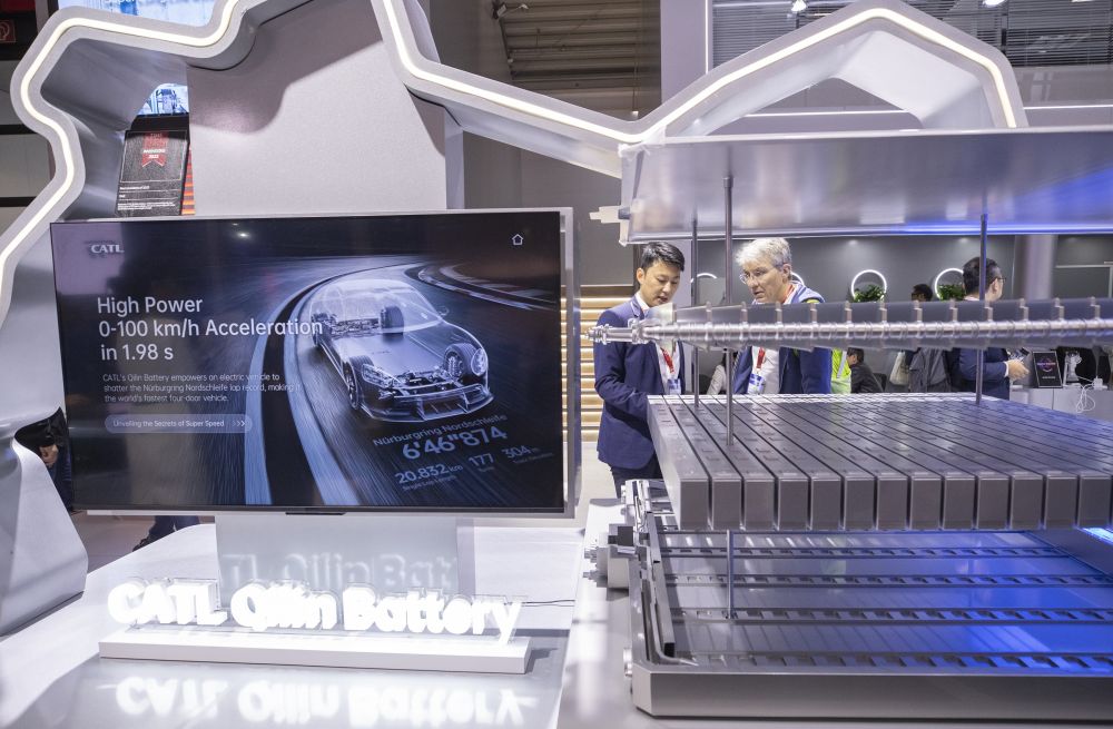 2025年9月10日,人们在德国慕尼黑国际车展的宁德时代展台洽谈。(张帆 摄)